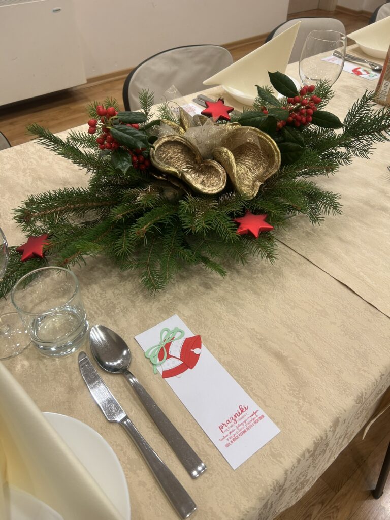 Za čudovito okrasitev miz je poskrbela naša dolgoletna članica gospa A.K., kar je dodatno popestrilo izgled 🤩 in vzdušje 🥳 novoletne večerje. Poleg tega so izpod njenih spretnih rokic nastali še kazalniki za knjige, ki so ga prejeli vsi, ki so se udeležili večerje. Hvala iz ❤️